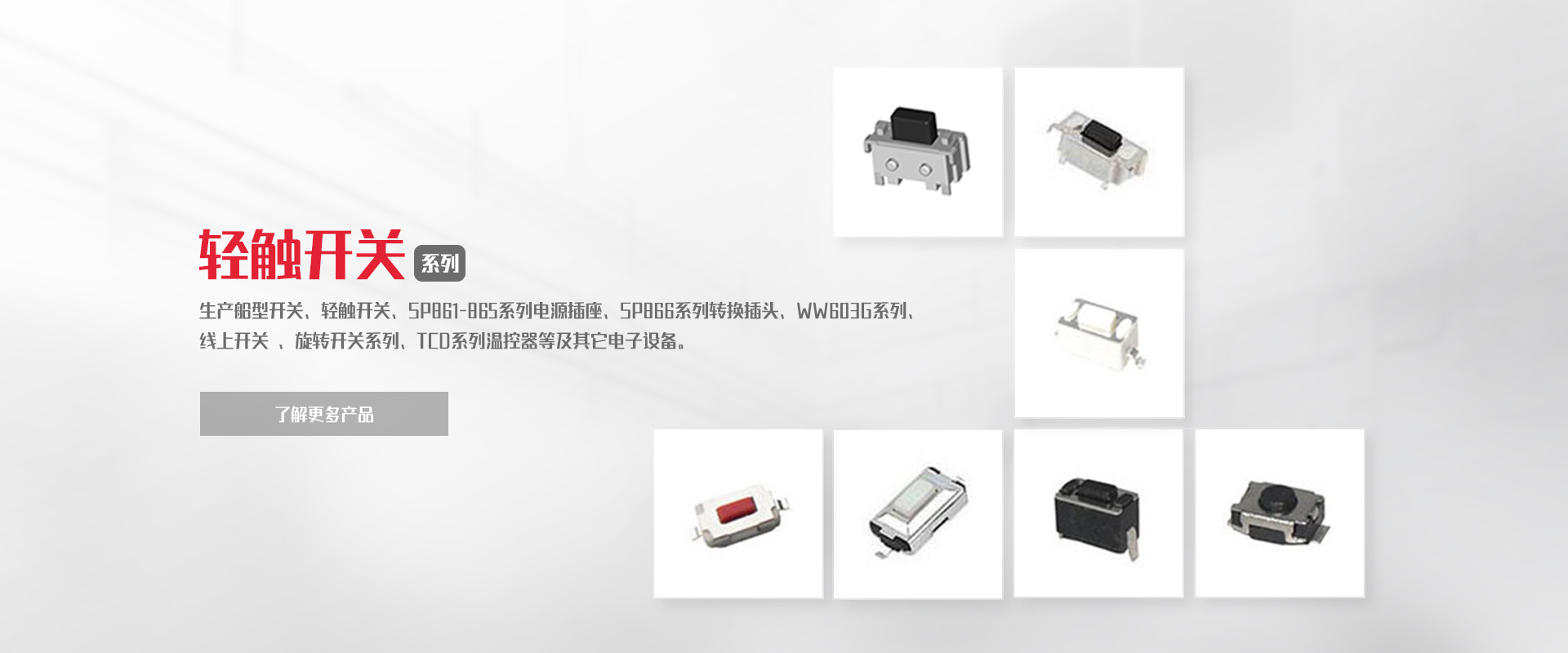 公司專(zhuān)業(yè)生產(chǎn)船型開(kāi)關(guān)、輕觸開(kāi)關(guān)、SP861-865系列電源插座、SP866系列轉(zhuǎn)換插頭、WW11系列微動(dòng)開(kāi)關(guān)、WW01-03、09系列按鈕開(kāi)關(guān)DS、WW系列指示燈開(kāi)關(guān)、WW603G系列 線(xiàn)上開(kāi)關(guān) 、旋轉(zhuǎn)開(kāi)關(guān)系列、TCD系列溫控器等及其它電子設(shè)備。